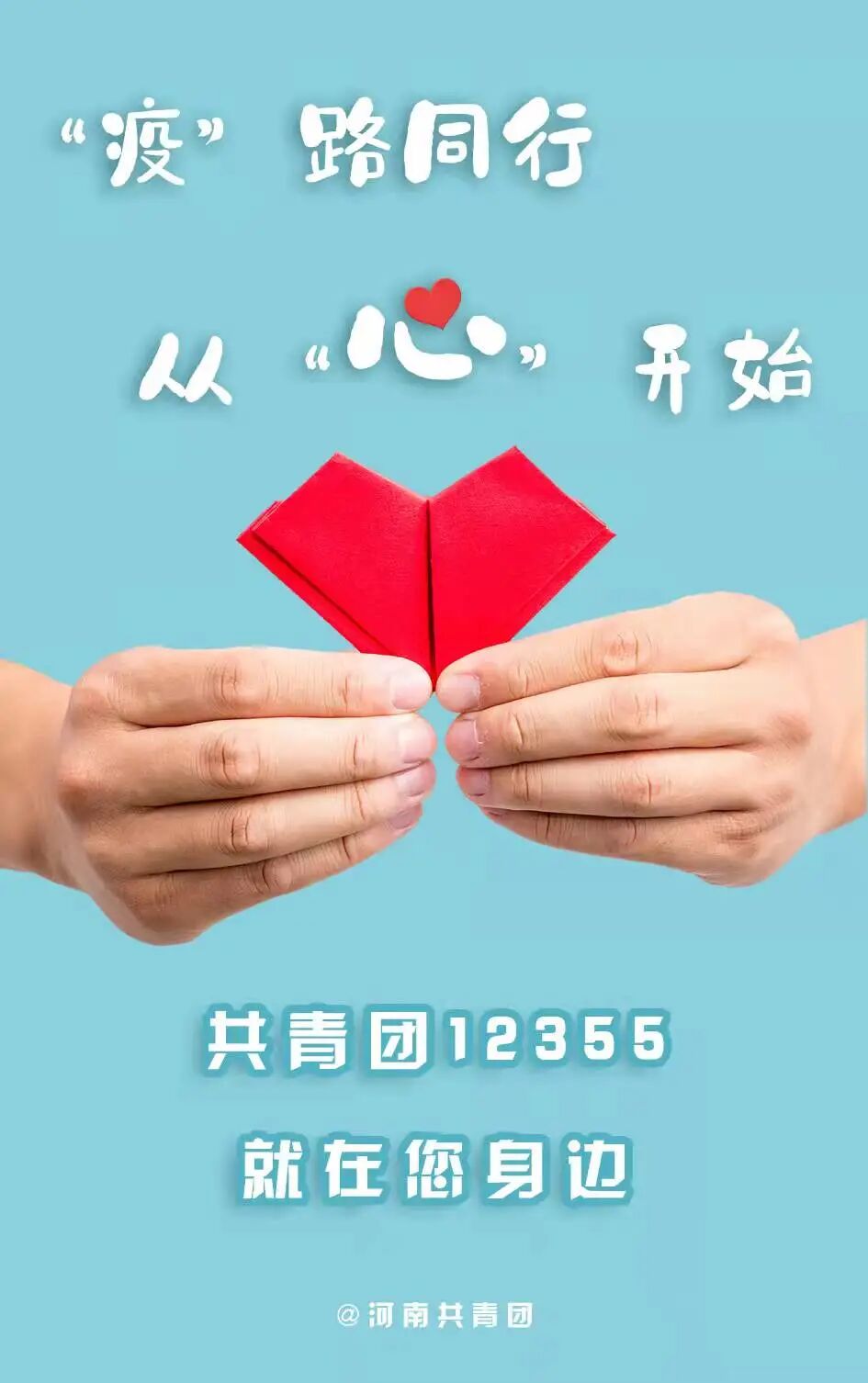 团团有个重要消息 要和小伙伴们分享 “12355”是共青团开展青少年权益服务的公益专线。河南省12355青少年服务台是共青团主办,依托专业力量、协同职能部门,直接面向青少年提供心理健康和权益维护的工作阵地,是各级团组织参与基层社会治理的有效载体。平台通过12355热线、微信公众号、小程序为全省青少年提供危机预防与救助、权益维护、心理健康、自护教育、家庭教育、困难帮扶、成长规划、素质拓展、就业创业、婚恋交友、司法保护等各种服务。 河南省12355青少年服务台 将永远伴你左右 成长有烦恼 省内朋友免区号 直接拨打12355 省外朋友可拨打 0371-12355